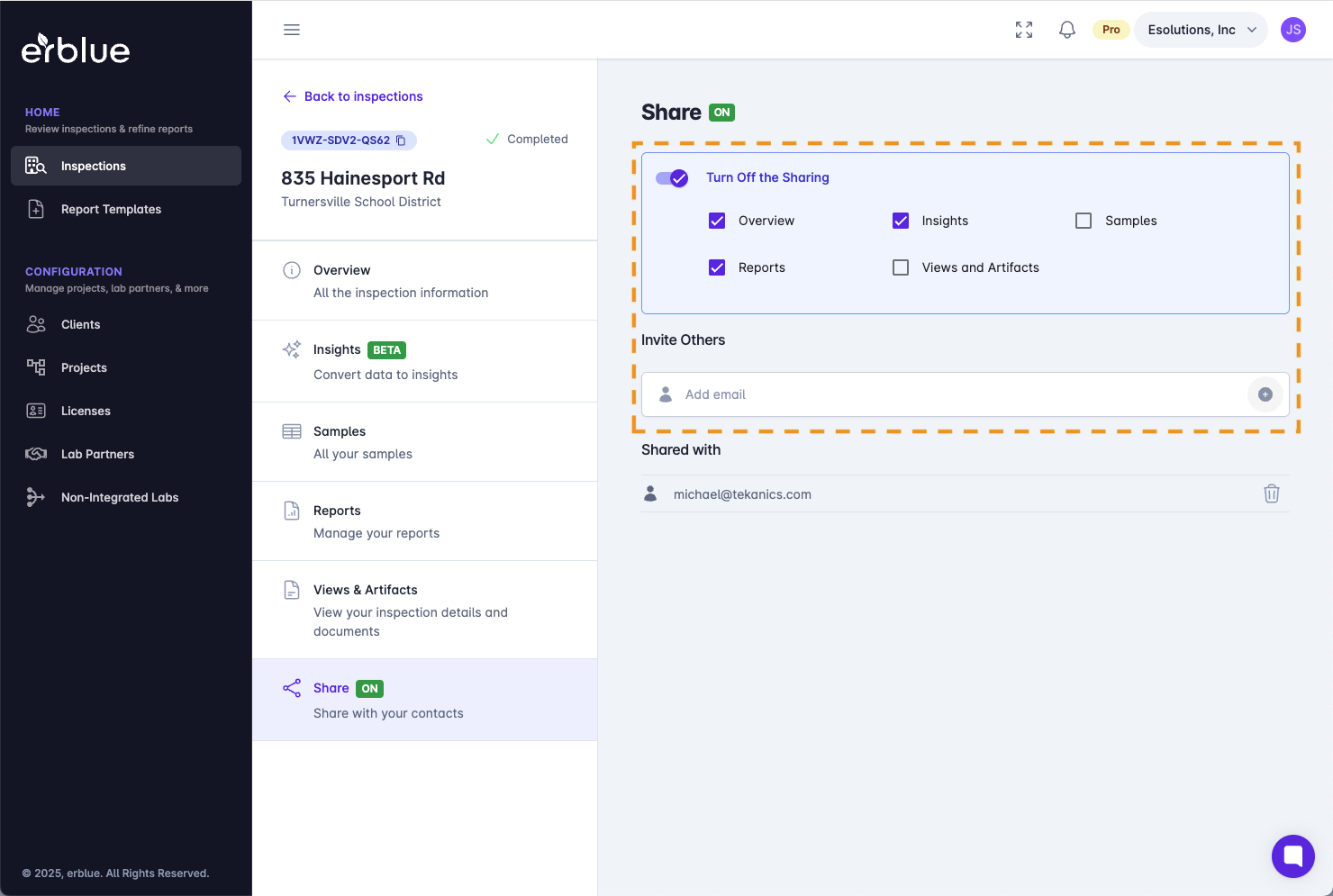 You can easily share your inspection and lab results with third parties. Just go to the Share section in the navigation menu. Turn on the sharing toggle and choose which inspection details to share. After selecting, enter the email address(es) of the recipient(s) and click the plus icon. They will receive a link via email to access the shared information.