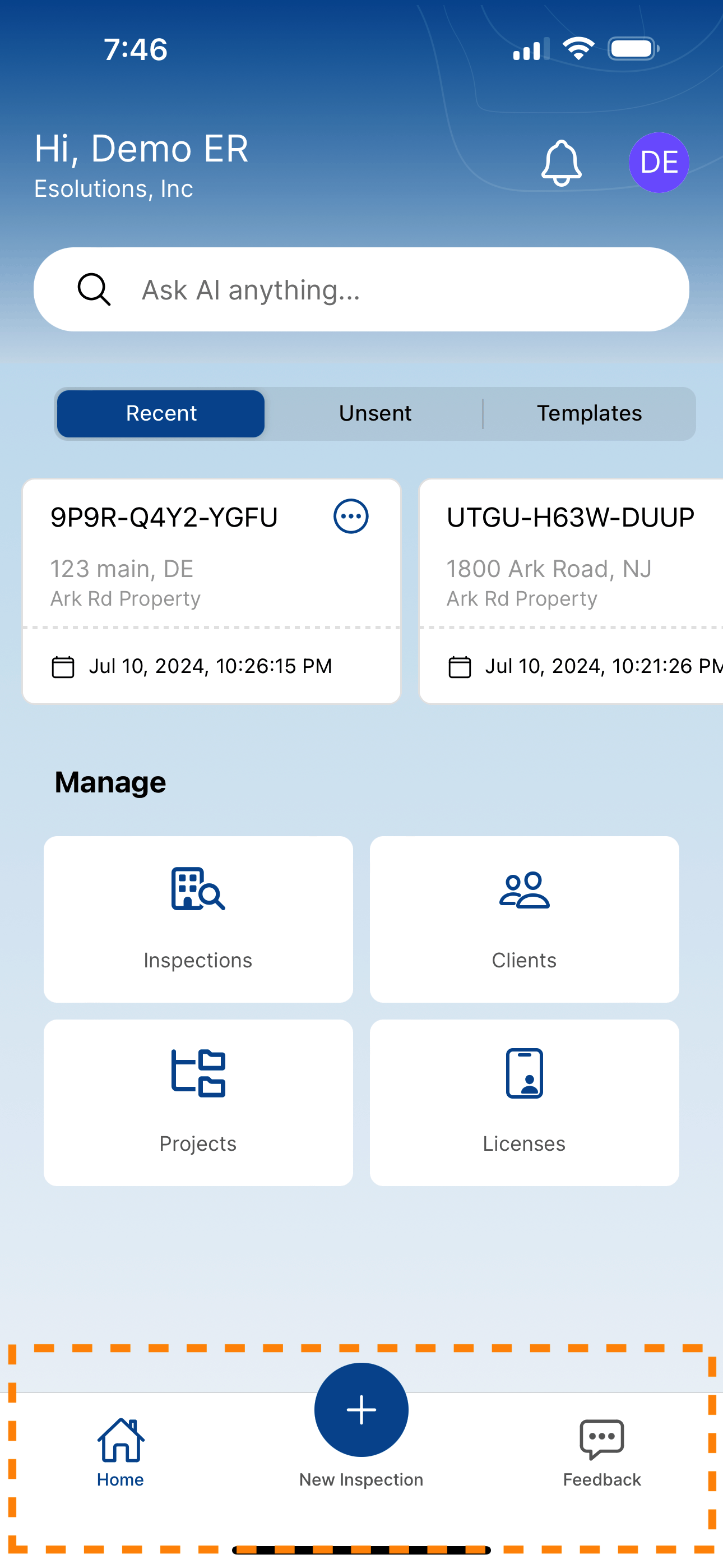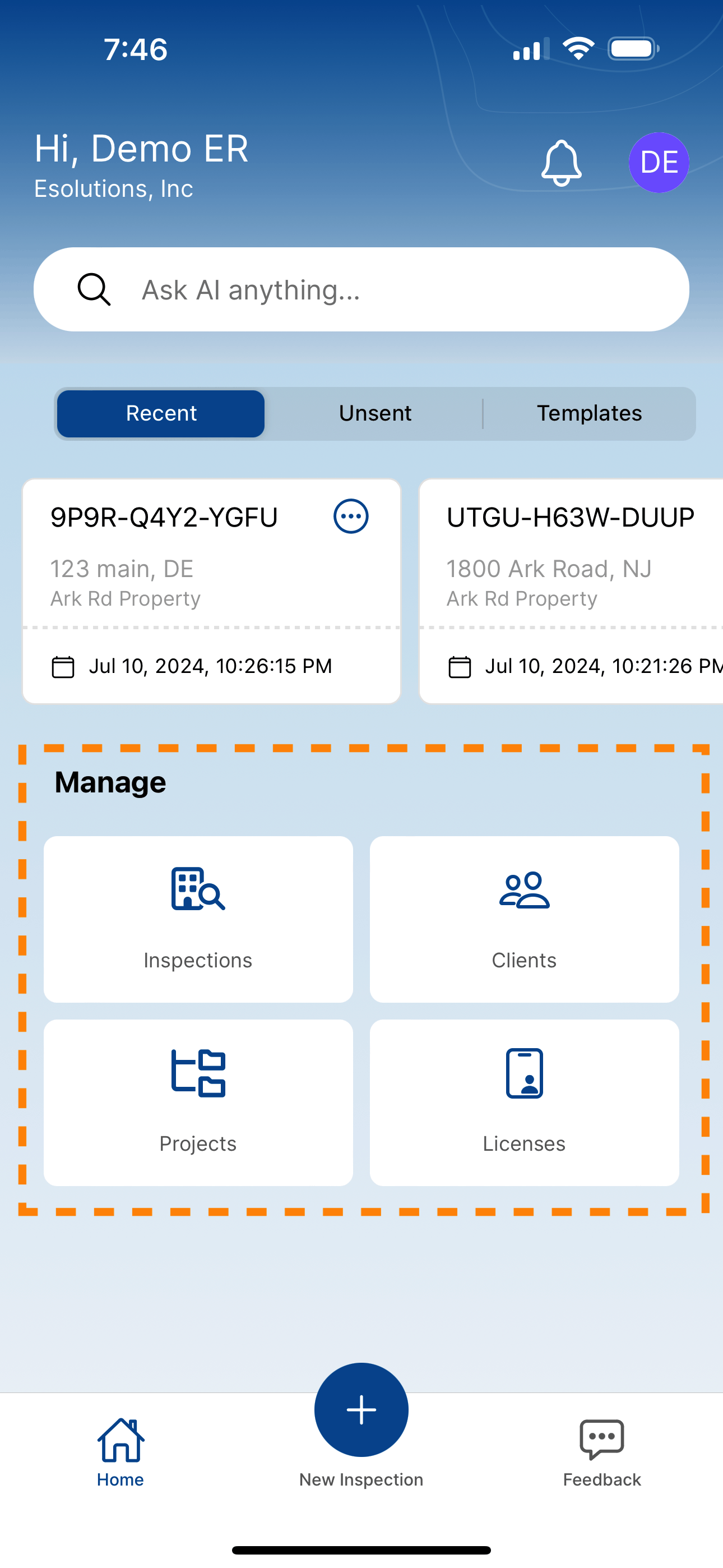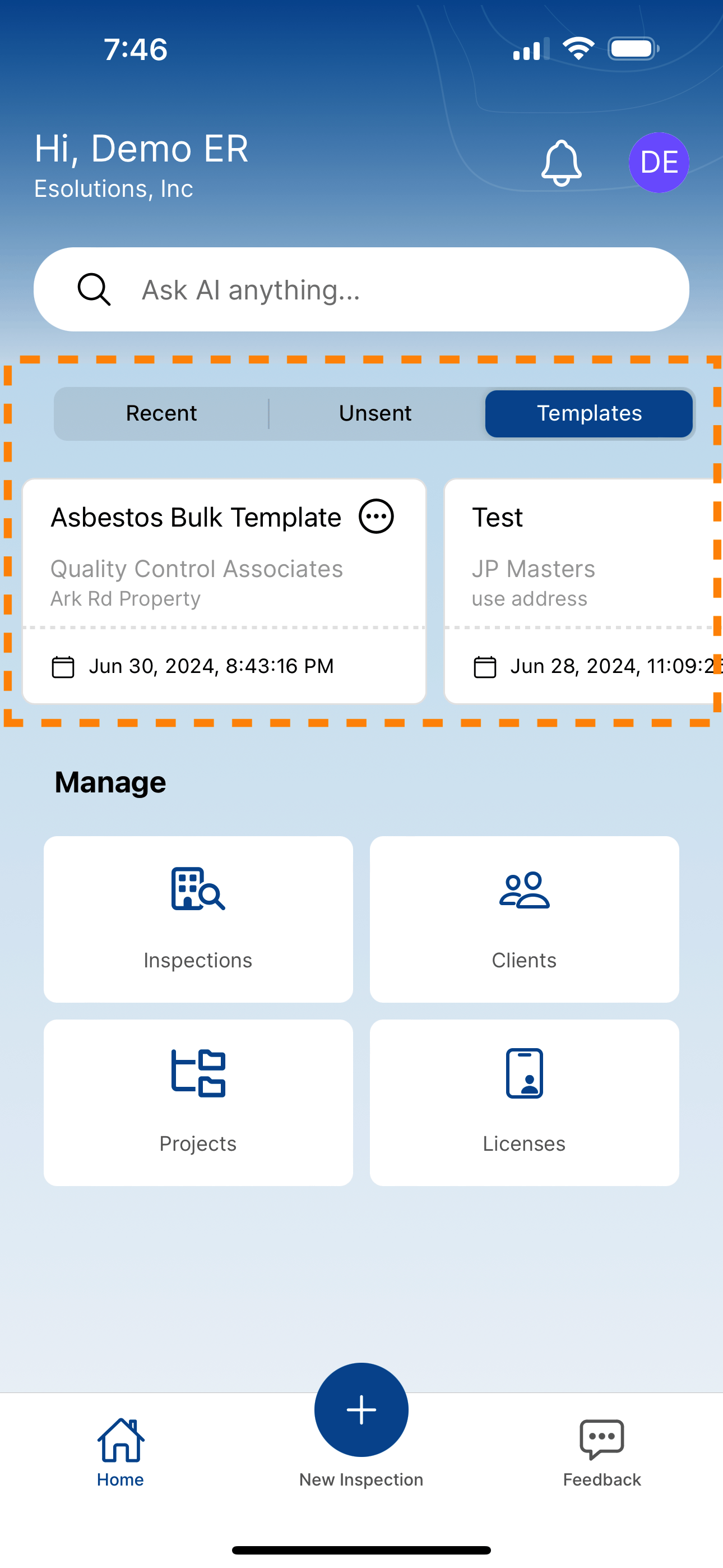 Above the manage cards, you will see a section with Inspection Shortcuts. You will see a filter that allows you to navigate between your Inspection Recent Inspections, Unsent Inspections, and Inspection Templates. Tapping the filter changes the cards available directly below the filter.