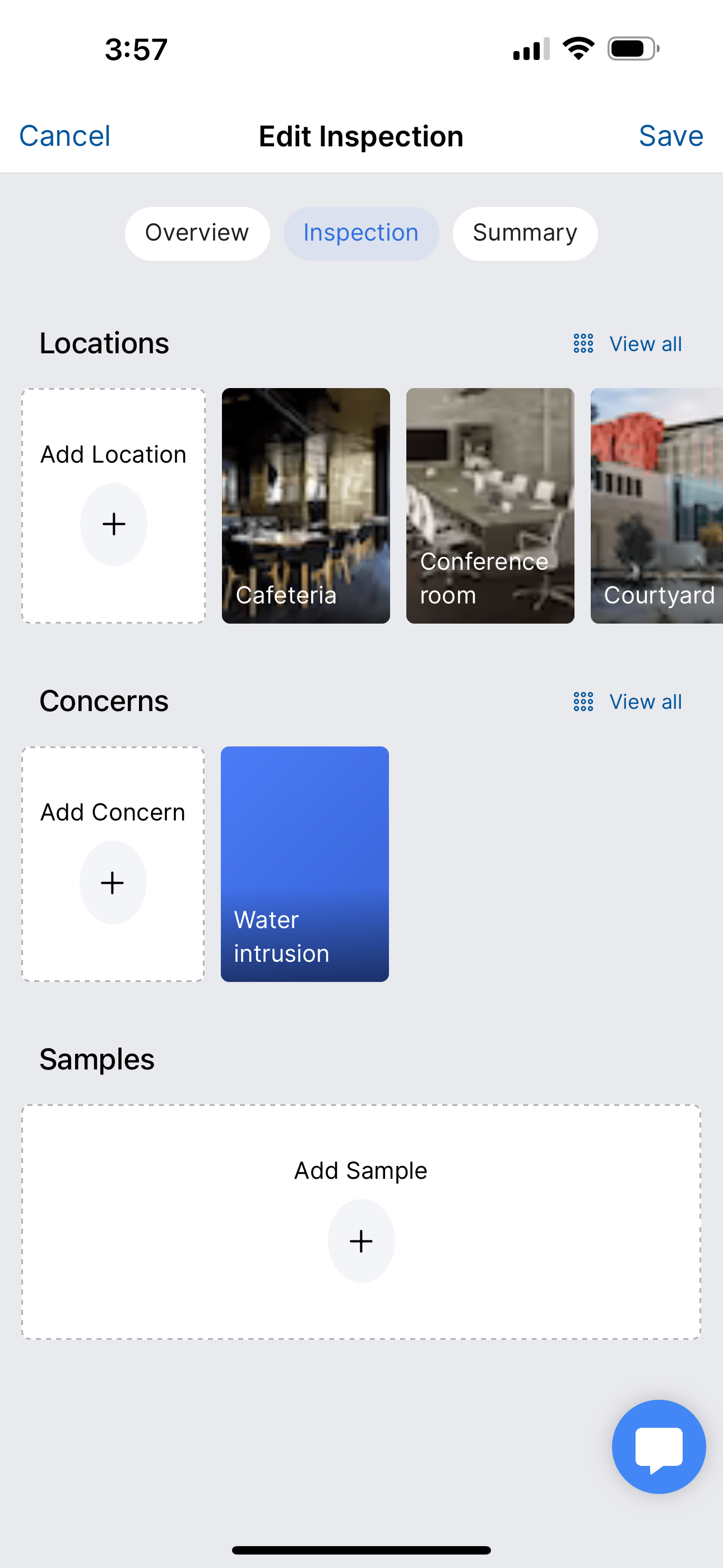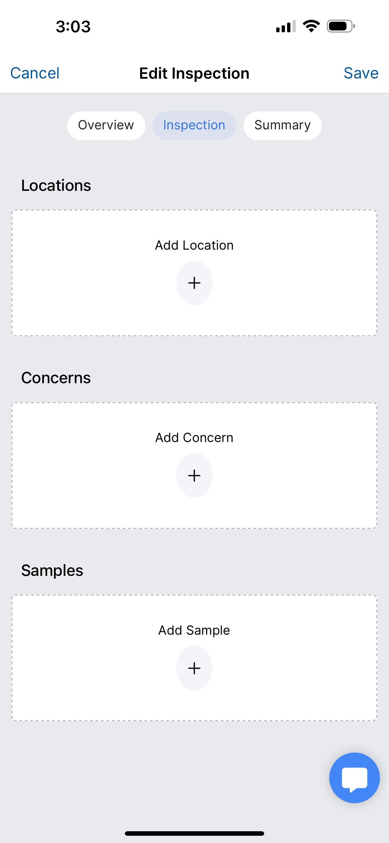 If you are doing an Asbestos Bulk inspection you will see a Materials card for adding materials to your inspection. If you are doing any other inspection type you will see Concerns instead. Adding concerns or materials to your inspection uses the same UI pattern as adding locations. For materials, you will see a list of available materials for the building type that you selected. For concerns, you simply tap Add Concern and fill in the information.