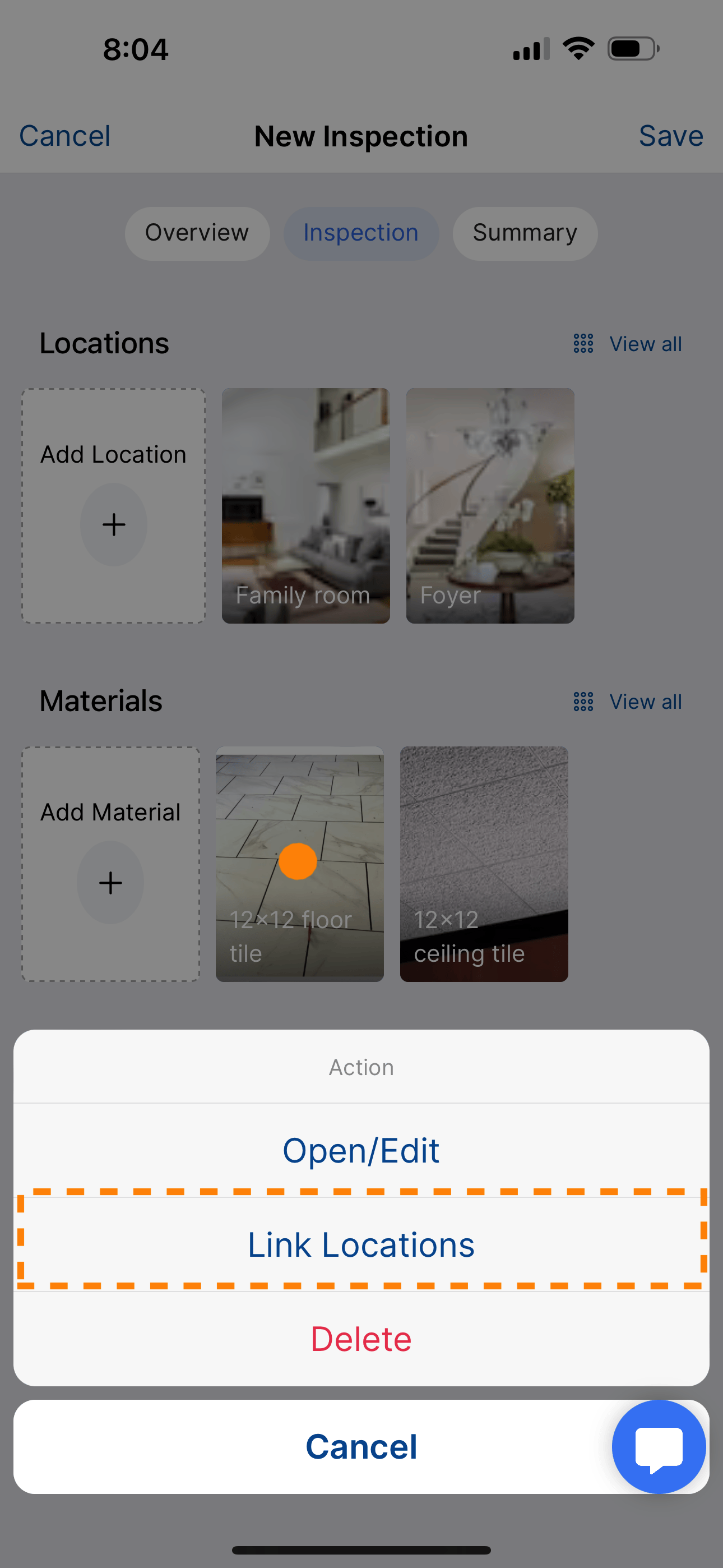Or conversely, you can tap on the location card and then tap Link Materials to select all of the materials that you have identified in that location.