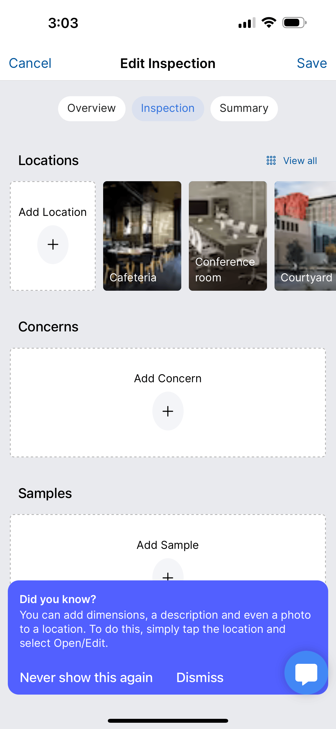Once you have added your locations they will be available on the Edit Inspection screen. You can add, remove, or edit locations at any time.
