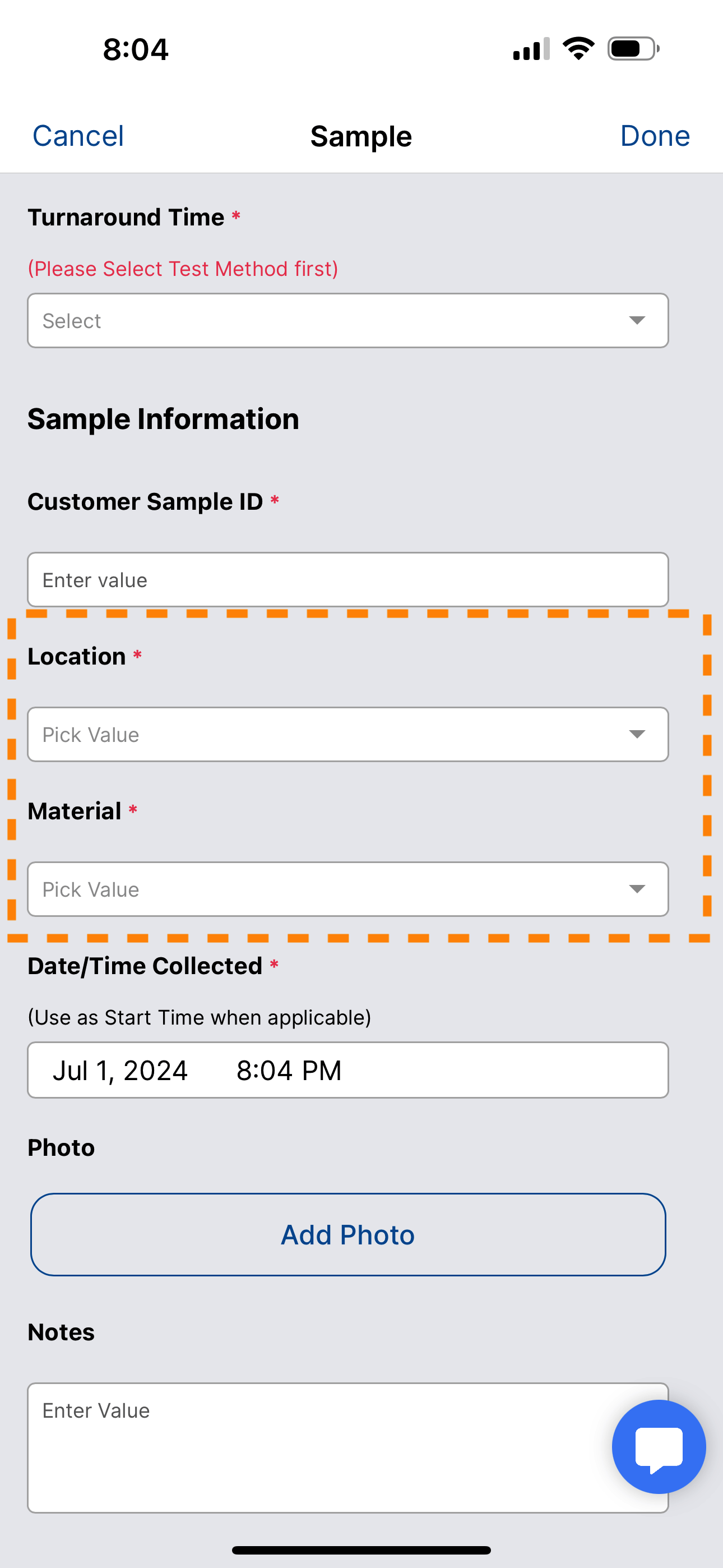 Taking Samples uses the same user interface pattern. Simply tap "Add Sample" fill in the information on the sample form and click done.