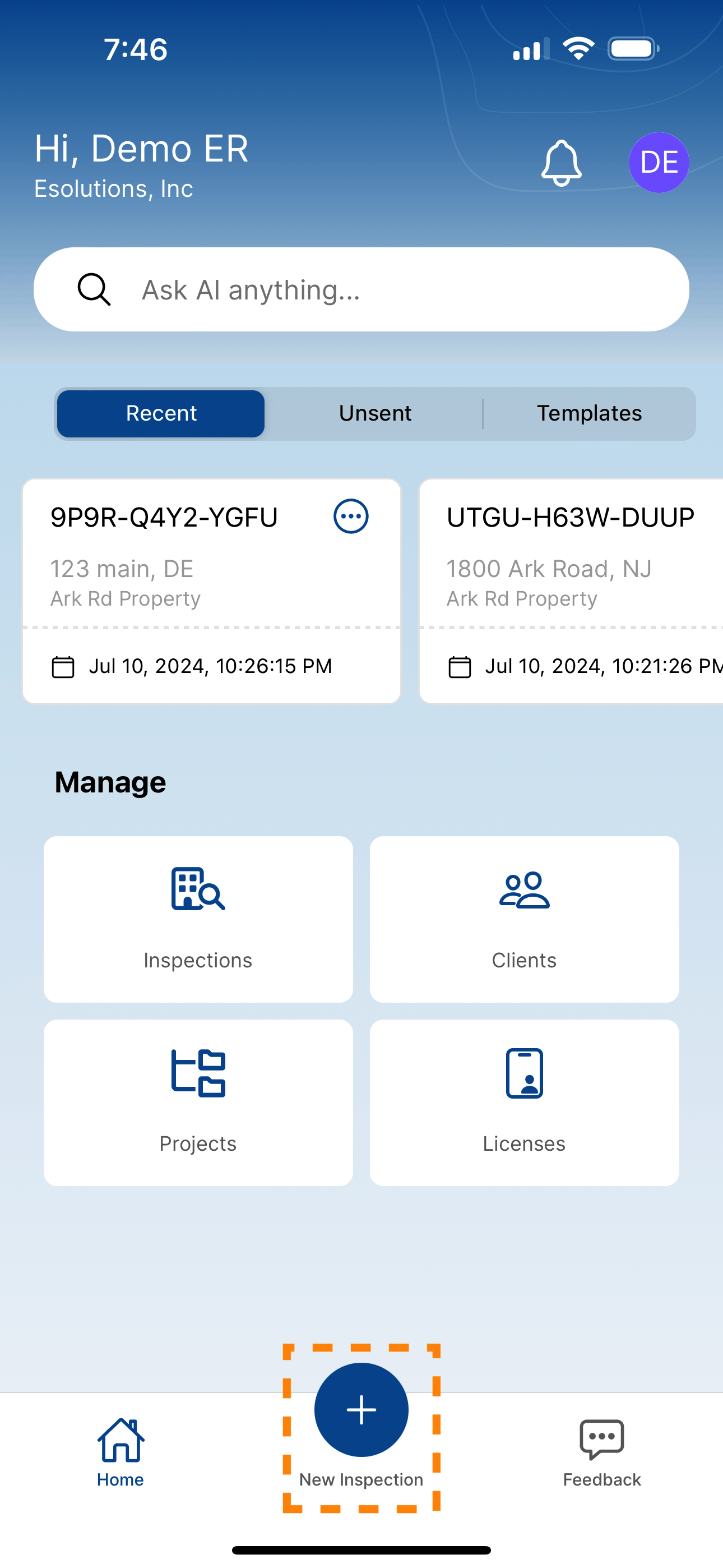 From the Home screen tap the New Inspection button