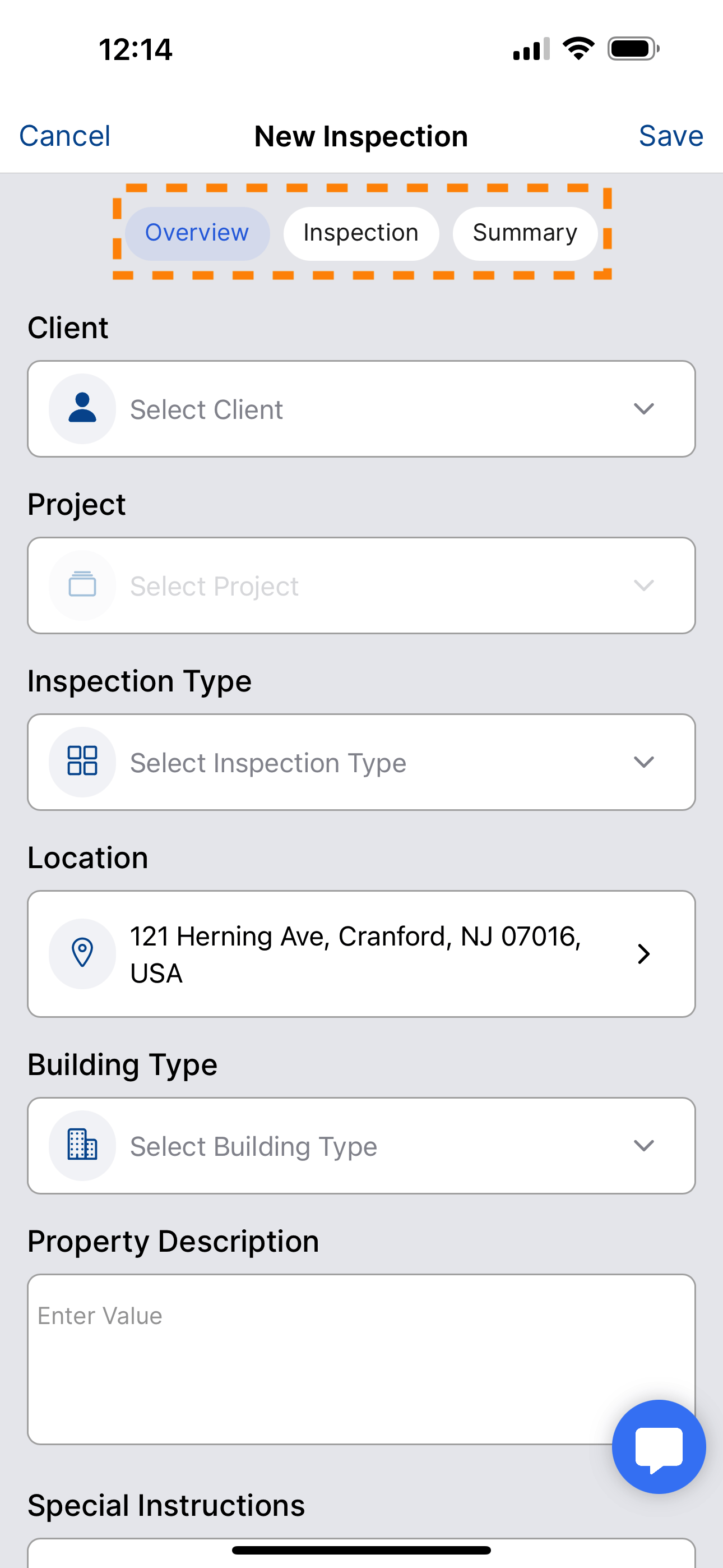 This starts a new inspection. You will see at the top of the screen there are pills that indicate which section of the inspection form you are on. This is the inspection navigation. Every time you start an inspection you start with filling out the Overview information.