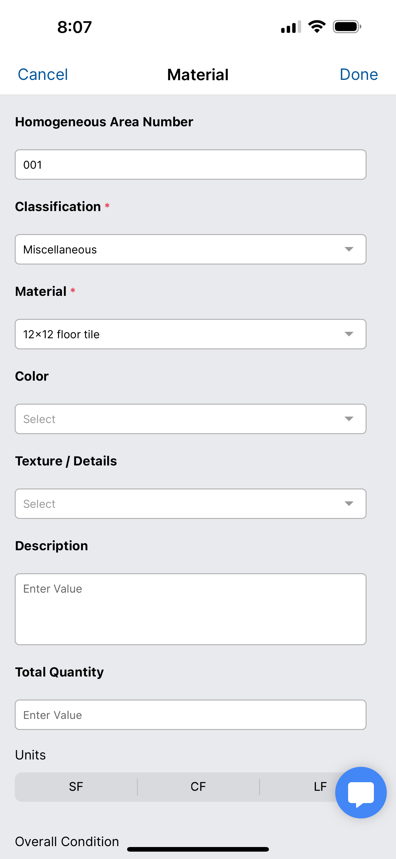 This will bring up the material form. On this form, you can edit the Homogeneous Area Number and add details about the material like the color, texture, total square footage and overall condition of the material. This information is important when creating reports.