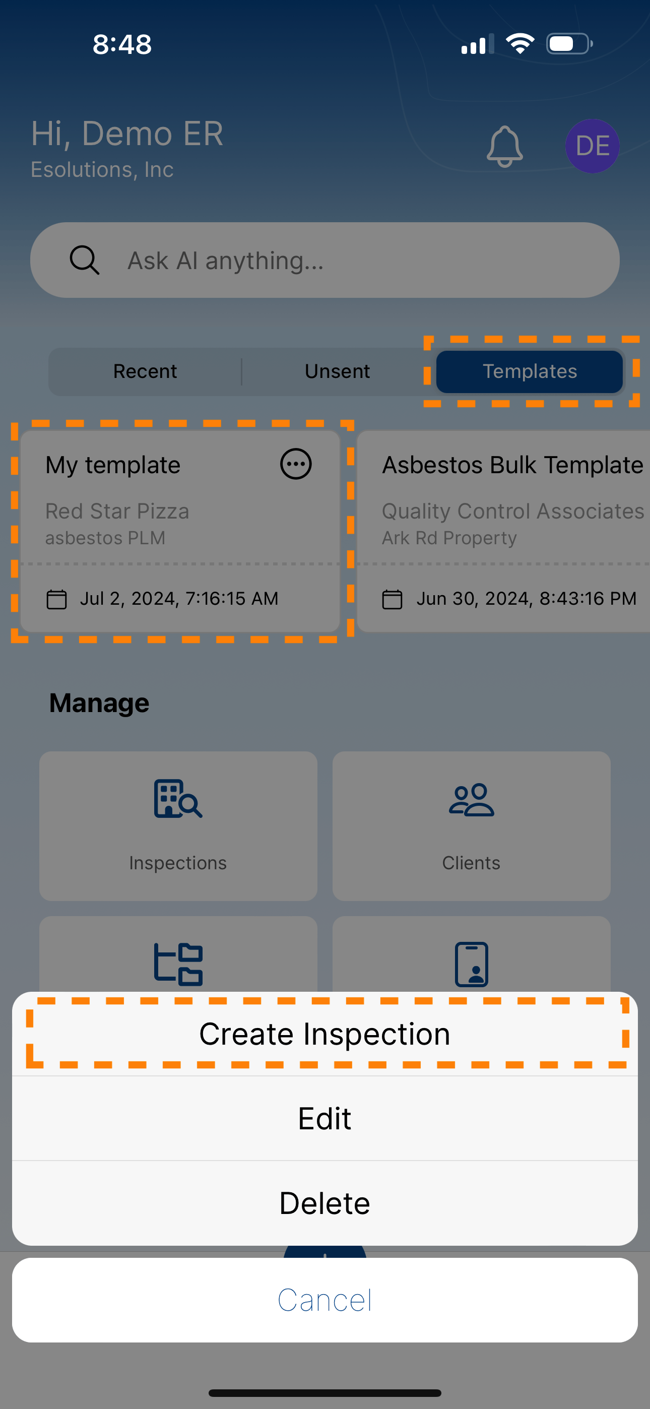 Inspection Templates are available from the Home screen. To use the inspection templates, make sure you have selected Template in your filter bar, then simply tap on a template card and then tap Create Inspection.