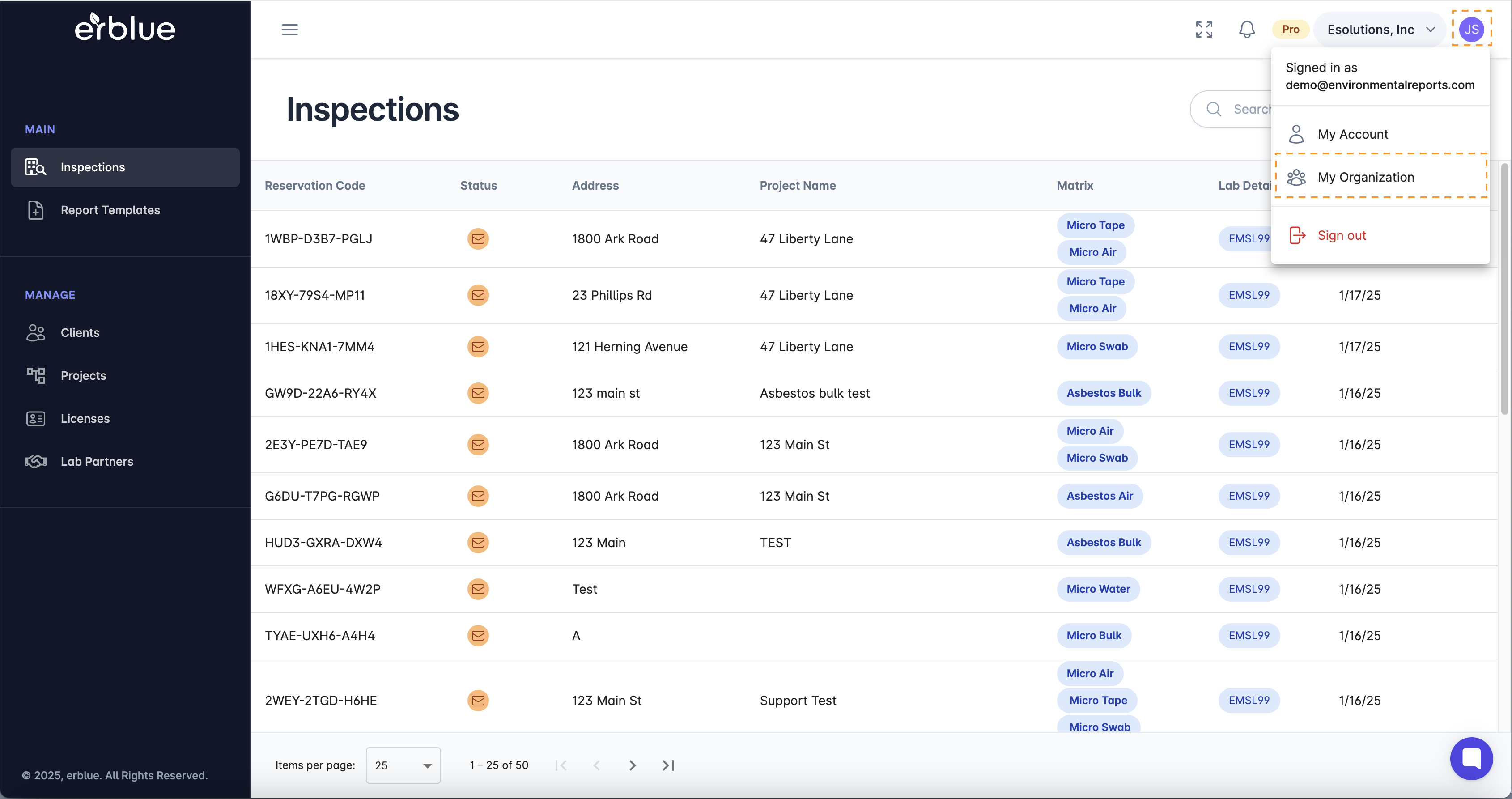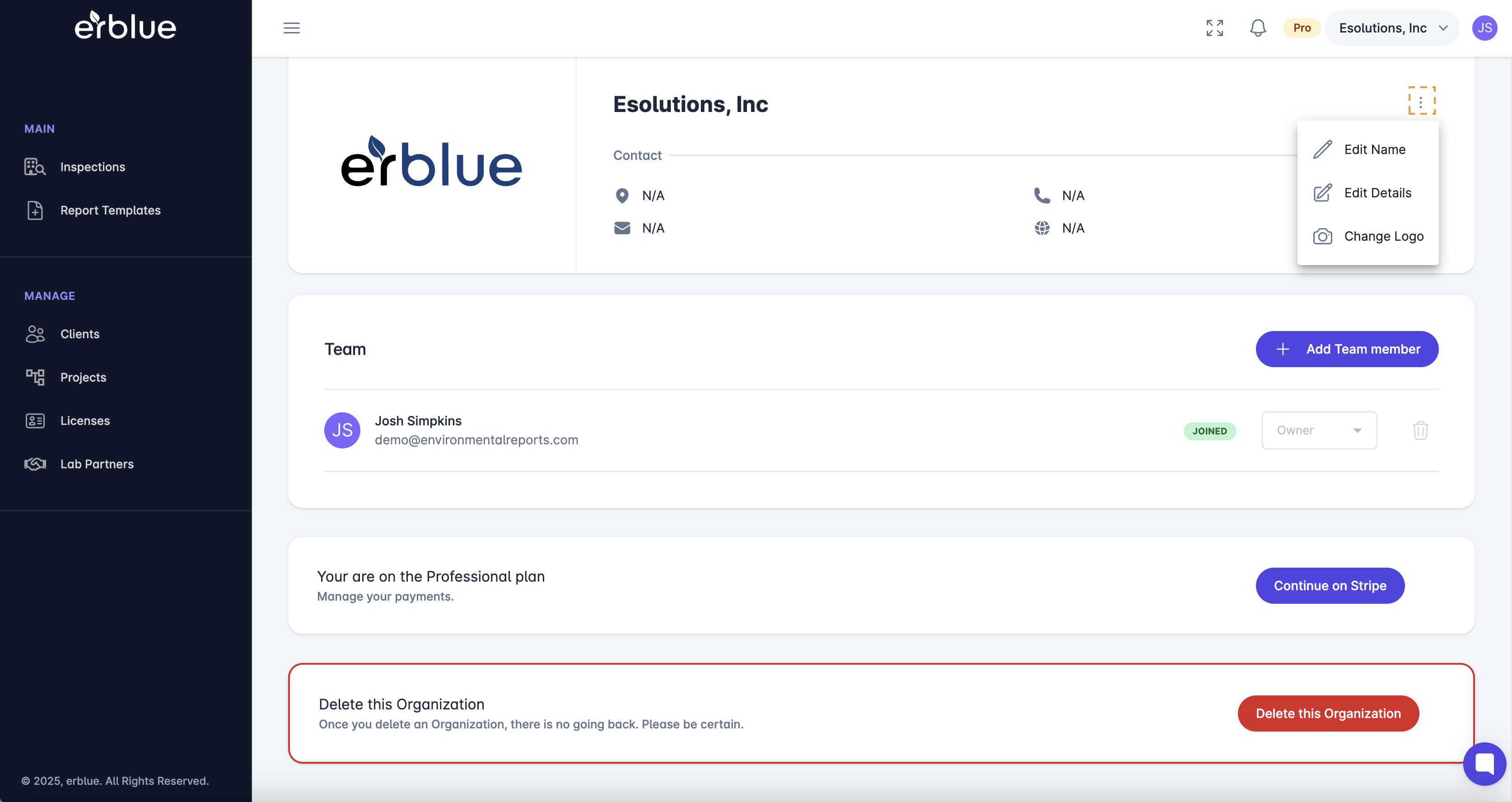 On the My Organization screen you will see a card with the name of your organization. Clicking on the elipse button will bring up a menu that allows you to edit your organization name, change the organization details, or change your logo.