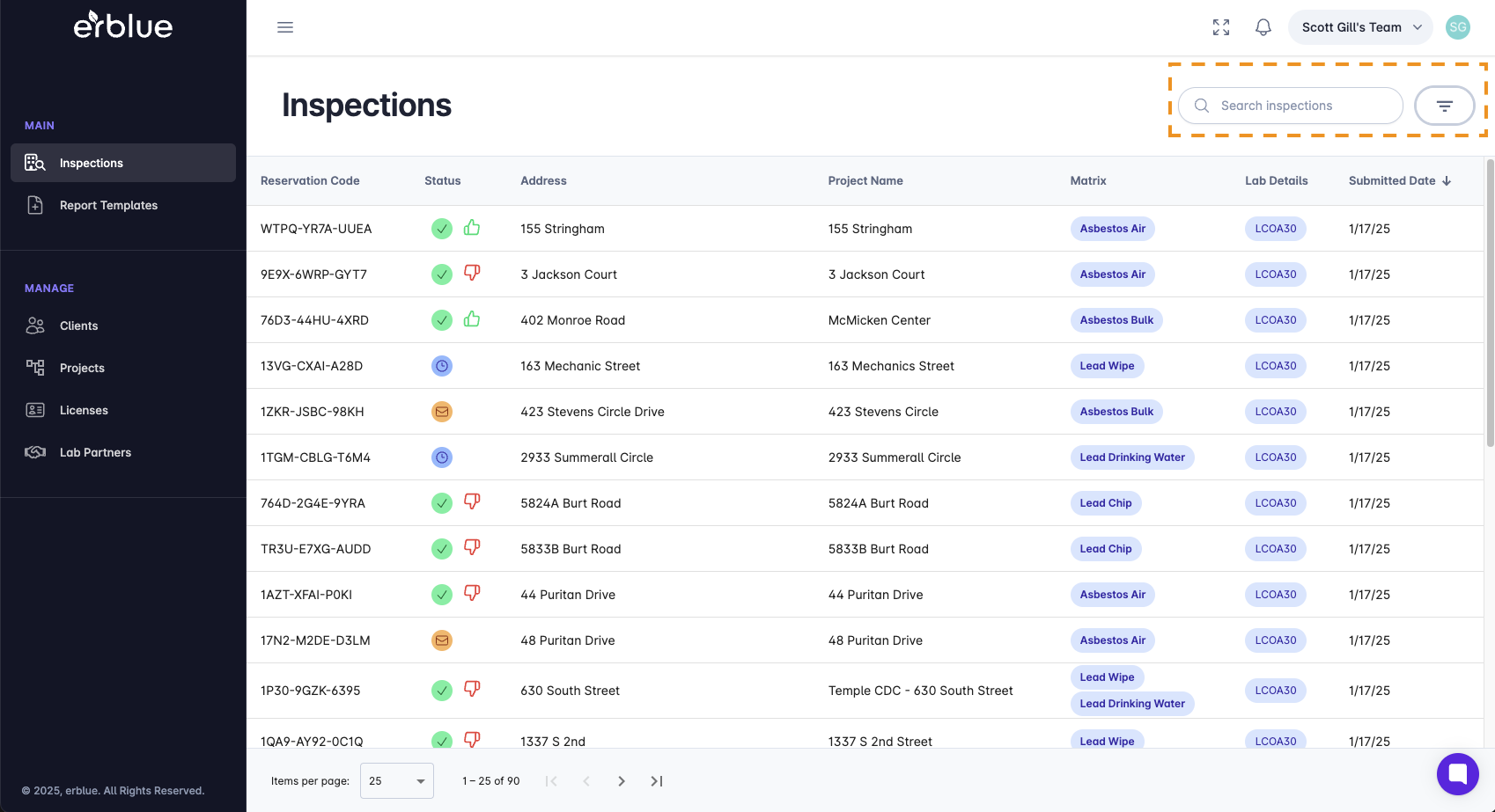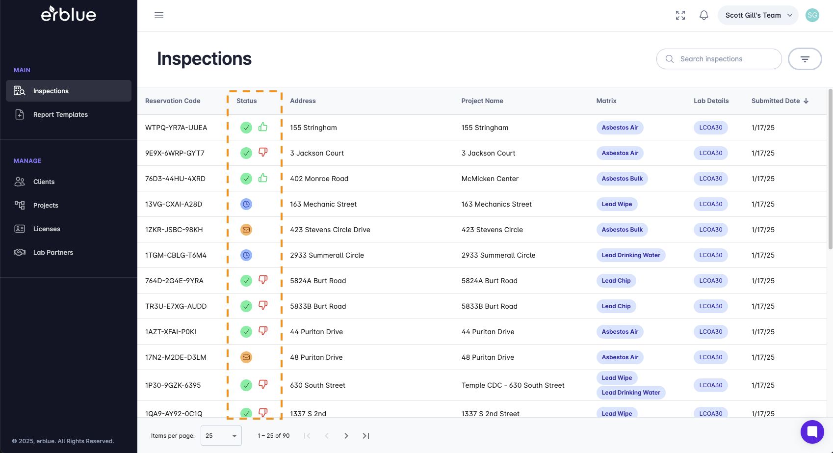 Each inspection listing has an icon indicating the inspection (order) status. A green circle with a check mark indicates that an order has been Completed. An orange icon with a clock indicates the order is In Progress. A blue icon with an exclamation point indicates that an inspection (order) has been Submitted to the partner lab, but testing has not been started.