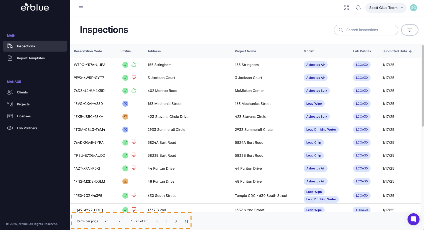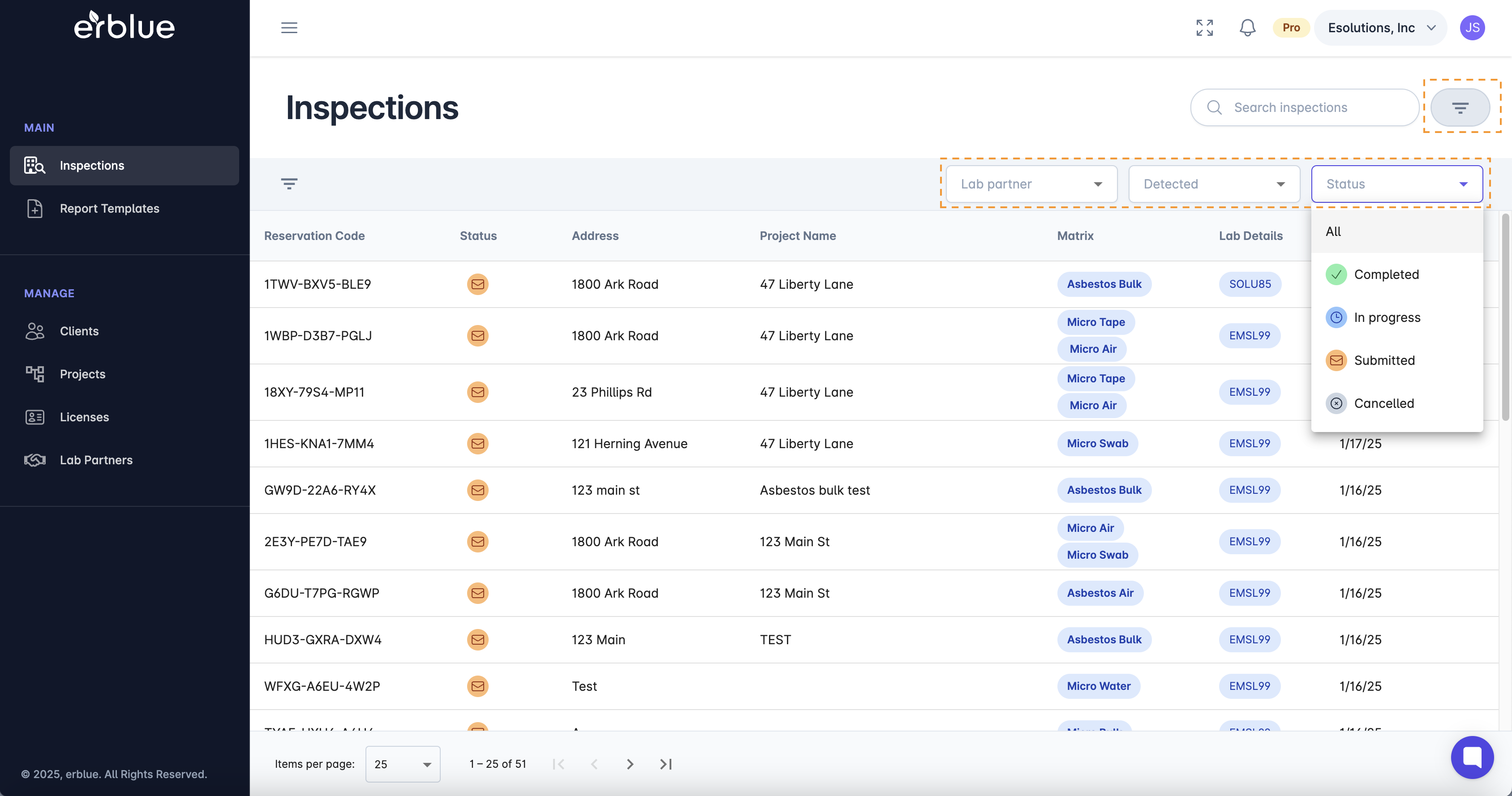 erblue provides you with a powerful interfact to view your inspections (lab orders). Inspections are listed in reverse chronological order. Your newest inspections will be listed first.