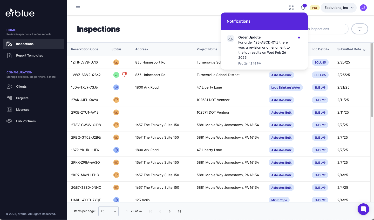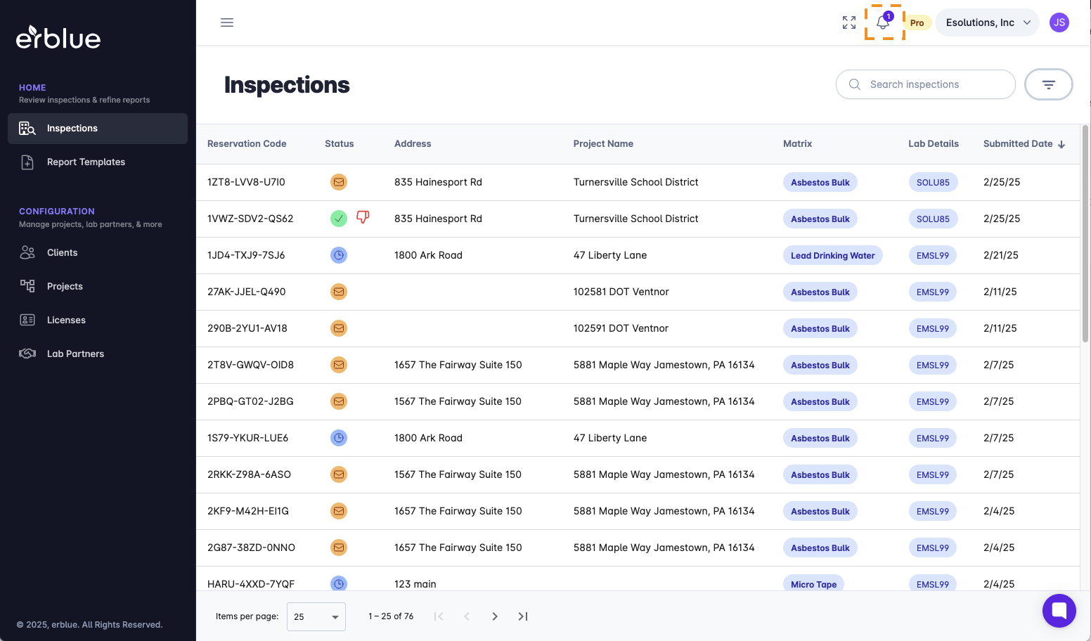 The erblue portal will occasionally notify you when there is something you should be aware of. In the upper right corner of the screen you will see a bell icon. If you have a notification, there will be a numeric indicator displaying the number of notifications you have.